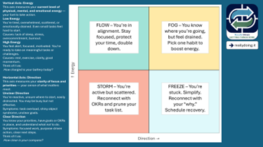 After listening to our 22nd podcast, your might want to download this matrix. a 2x2 with Energy on one axis, Direction on the other. Four quadrants. Four types of weeks. And four very different outcomes.